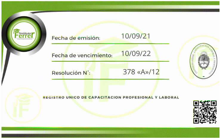 • Certificado y Analítico Instituto Ferrer: Aval Nacional. Avalado mediante personería jurídica por la Fundación Ce.Pro.Fa. Nº de resolución 378 «A»/12. Enmarcado en la Ley Nacional de Educación N° 26206/06 art 48. Título IX, y art. 112. Certificado con código único QR para la validación y verificación de autenticidad. Las certificaciones cuentan con un código QR único. Este código QR puede ser escaneado desde cualquier lugar del mundo, proporcionando una manera rápida y sencilla de verificar la autenticidad de la certificación y los detalles de la capacitación recibida.